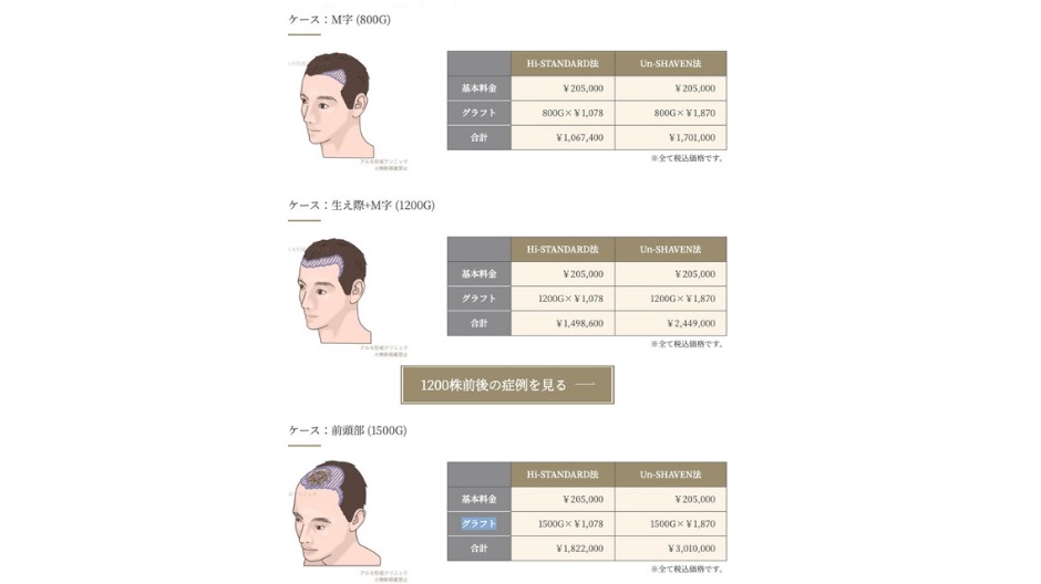 • Hi‑STANDARD法(刈り上げるFUE)では1グラフト1,078円