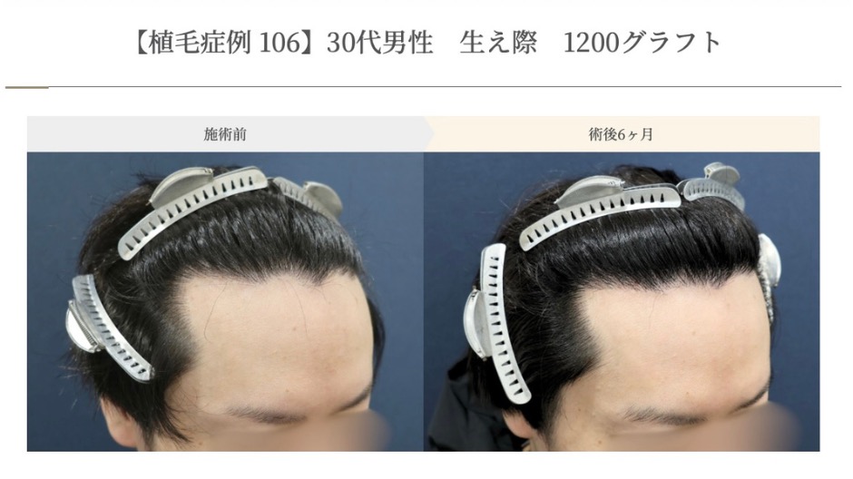 実際の症例では、髪質や株数によって仕上がりが変わりますが、この写真のように「額が狭くなる」効果が期待できます。